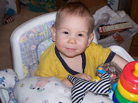 Scott also bought him a toy that has about 5 rings that stack in order over a cone. Our guests gave Jonathan a car that has popping balls inside of it. He really likes pushing it down the hallway. I will post a few pictures that I know everyone is wanting to see. I will try to post a few more later on as well.